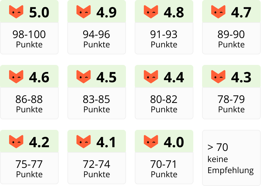 Am Ende steht ein Gesamtwert in unserem Punktesystem von 0 bis 100 – klar, nachvollziehbar und vergleichbar. Dieser Wert wird in den Finanzfuchs Score (0,0 bis 5,0 Sterne) übersetzt. Produkte mit mindestens 70 Punkten schaffen es in den Vergleich – alles darunter empfehlen wir in der Regel nicht. Die Bewertung erfolgt transparent, nachvollziehbar und immer auf Basis journalistischer Sorgfalt und einer inhaltlichen Prüfung des Finanzfuchs-Teams.