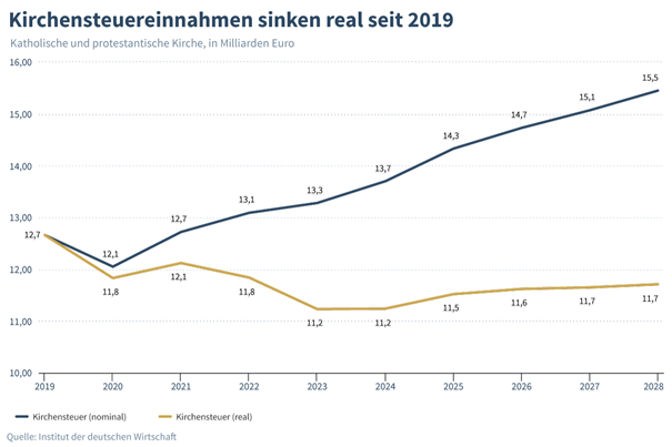 Für weitere Einnahmeverluste sorgt die Inflation. Obwohl die Kirchen 2023 anderthalb Prozent mehr Kirchensteuer eingenommen haben als im Vorjahr, bleiben ihnen kaufkraftbereinigt 5 Prozent weniger als 2022. Das ergab eine Berechnung des Instituts der deutschen Wirtschaft (IW). Die Schere zwischen nominalen und realen Kirchensteuereinnahmen wird laut IW in den kommenden Jahren weiter auseinandergehen. IW-Finanzexperte Tobias Hentze prognostiziert: „Die Kirchenfinanzen werden keine rosigen Zeiten mehr sehen.“